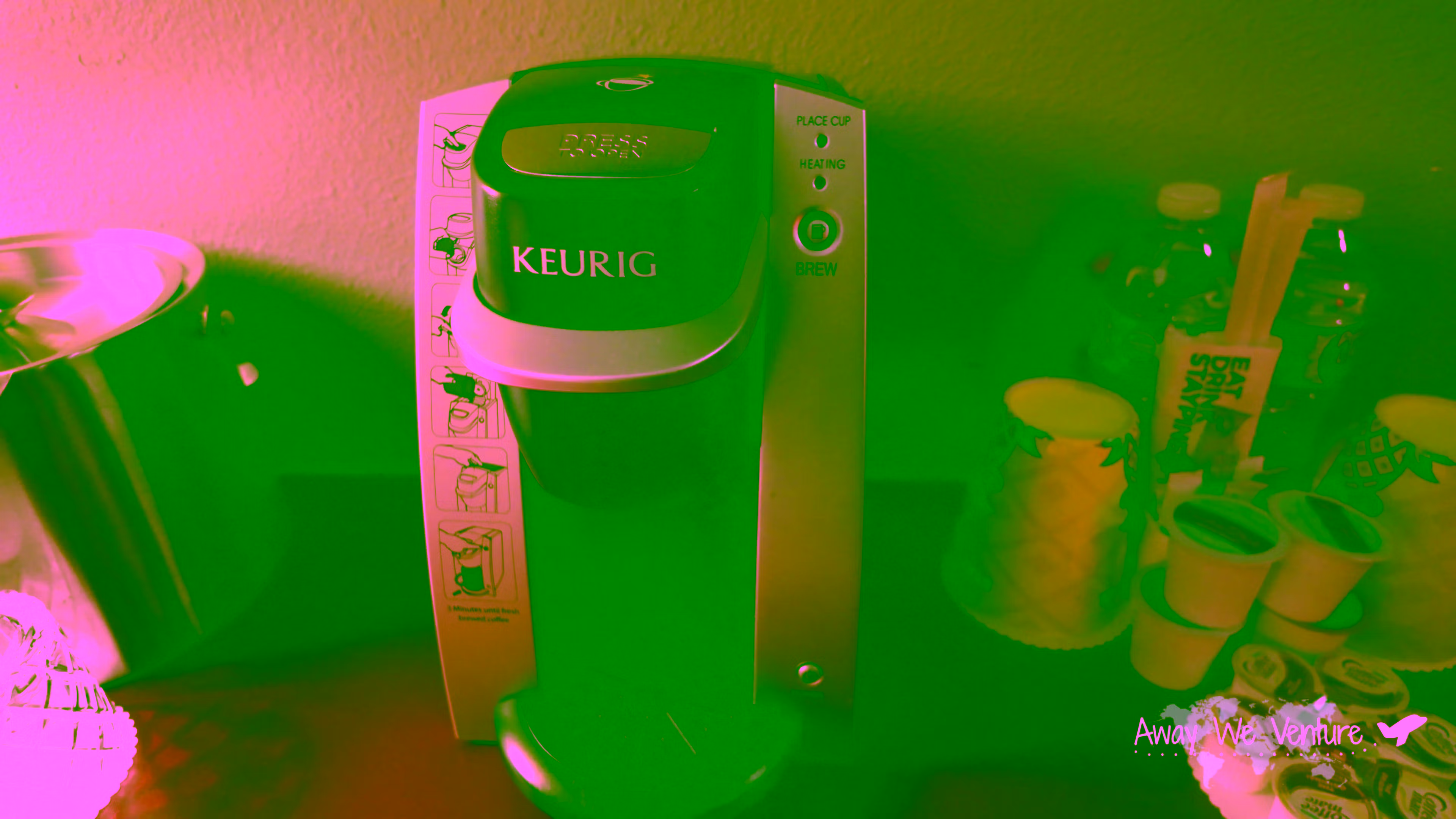 The room comes with a Keurig machine loaded with a ton of different coffee cups and cream/sugar. Alongside two extra additional bottled water and a ice machine bucket. All available at no extra charge!