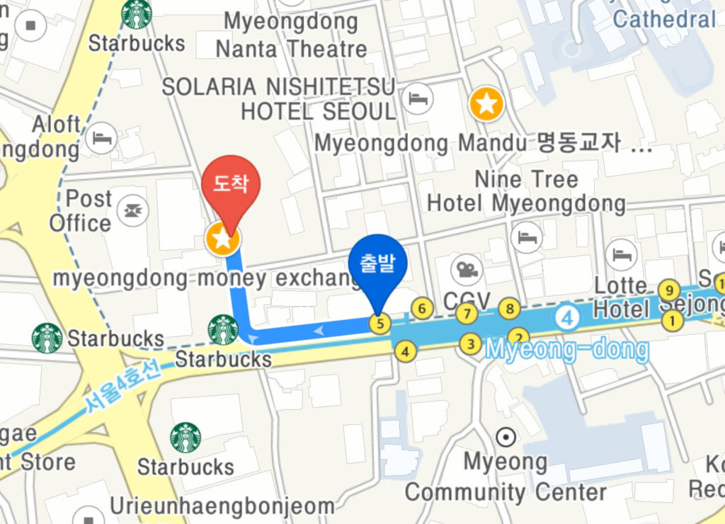 - Get off at Myeongdong Line 4 Subway Station Exit 5
